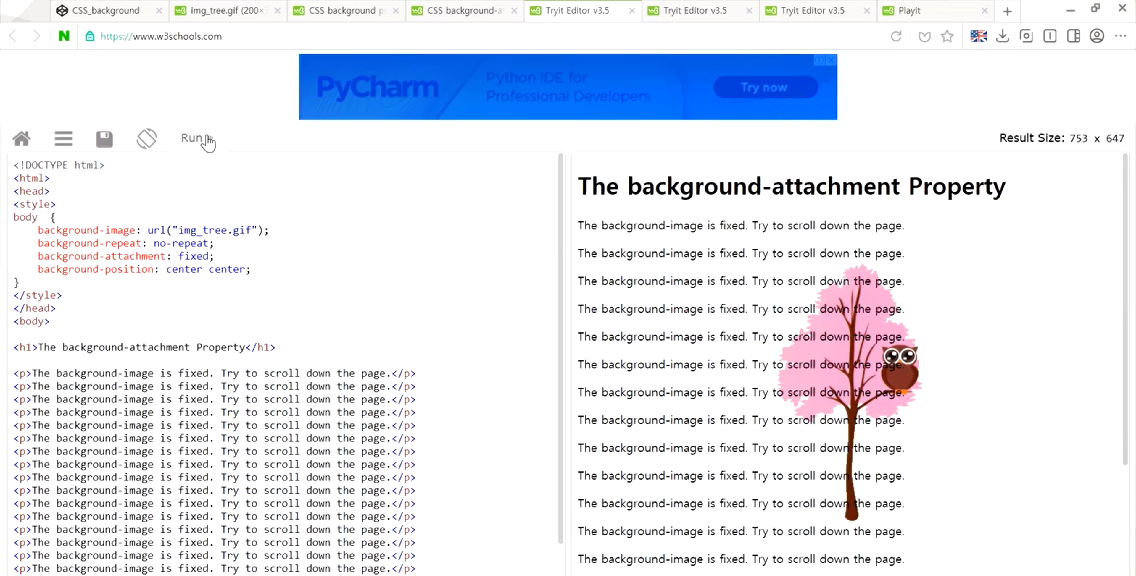 | fixed | 배경 이미지는 뷰포트를 기준으로 고정되어 있으며 스크롤에 영향을 받지 않습니다. |