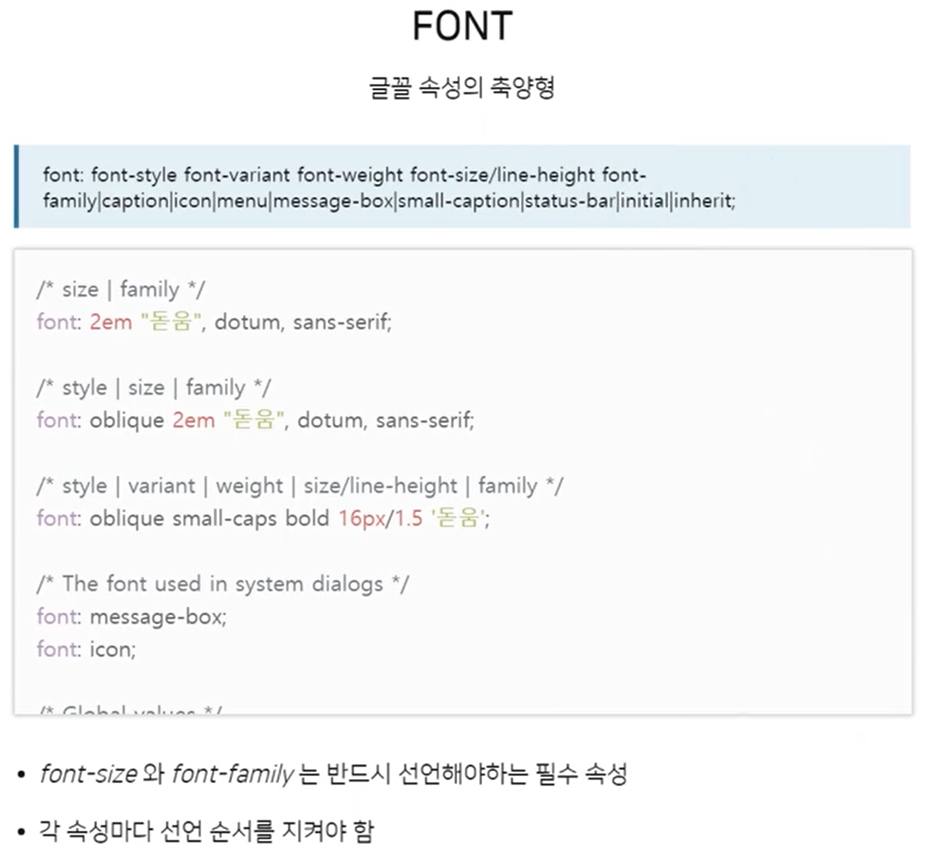 - font-size와 font-family는 반드시 선언해야 하는 필수 속성입니다.