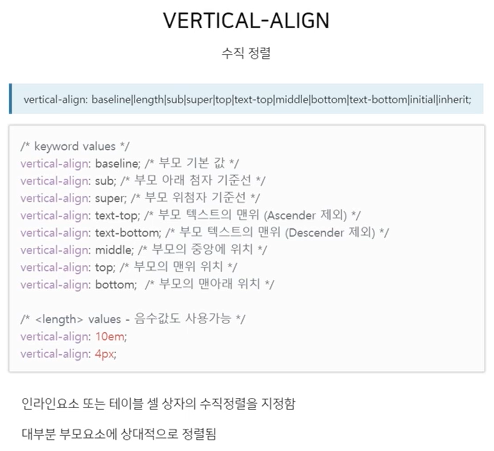 - keyword sub : 부모 아래 첨자 기준으로 정렬 super : 부모 위 첨자 기준으로 정렬 text-top : 부모 텍스트의 맨 위(Ascender 제외) text-bottom : 부모의 텍스트의 맨 아래(Descender 제외) middle : 부모의 중앙에 위치 top : 부모의 맨 위 위치 bottom : 부모의 맨 아래 위치