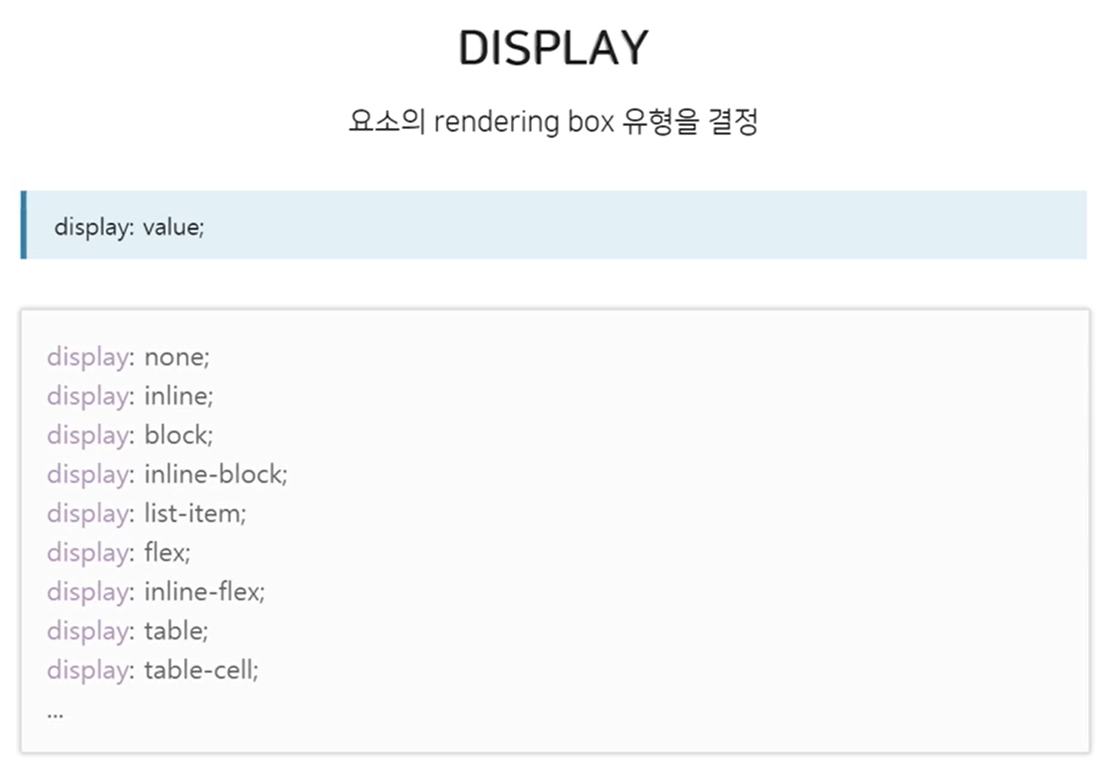 - 그외에 list-item, flex, inline-flex, table, table-cell 등 다양한 속성 값 존재