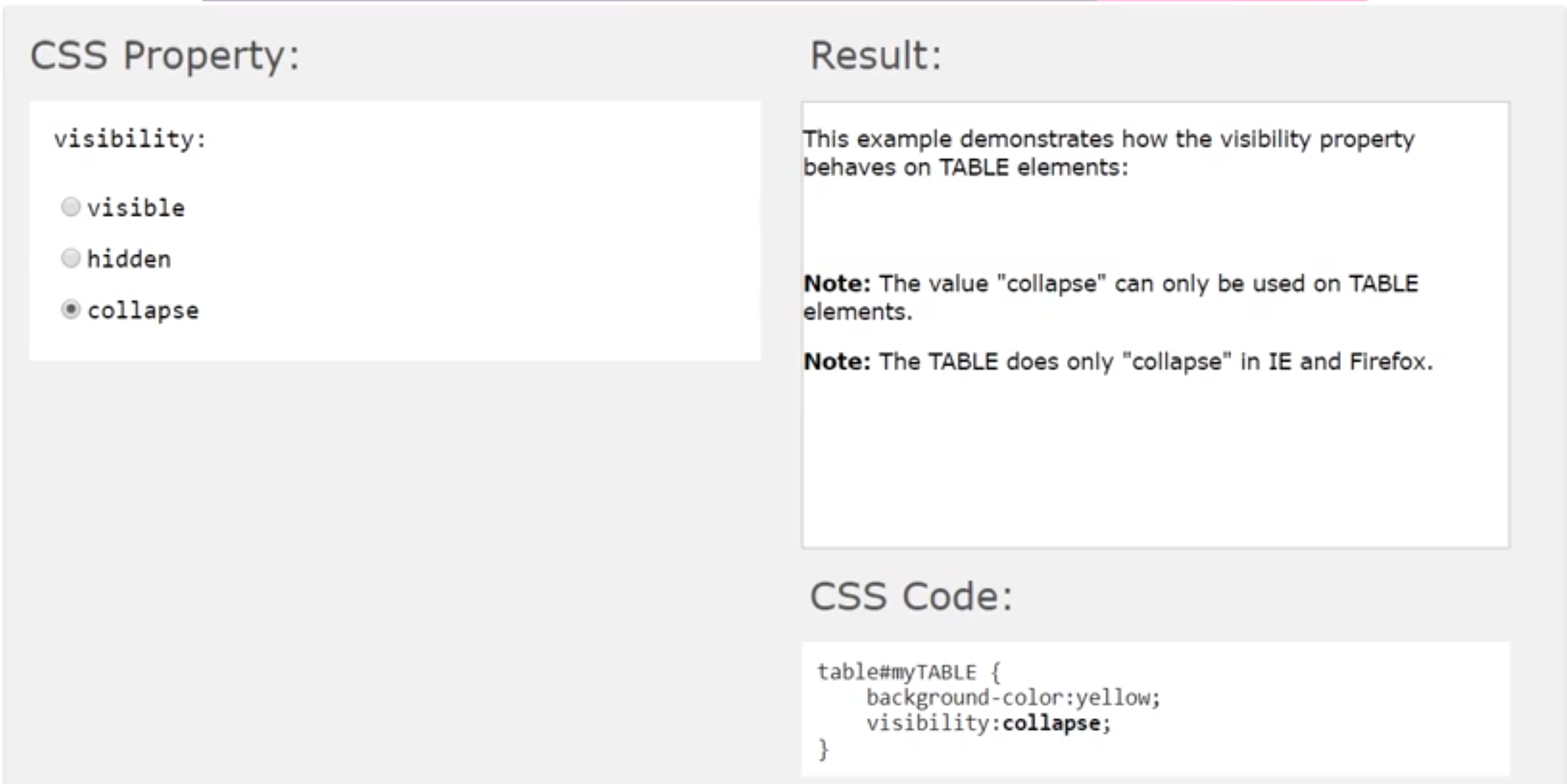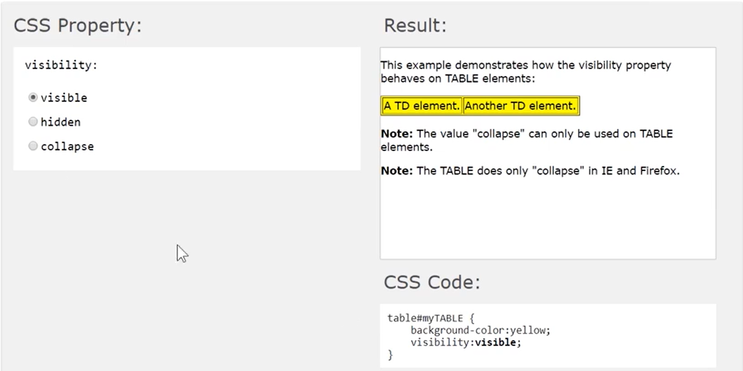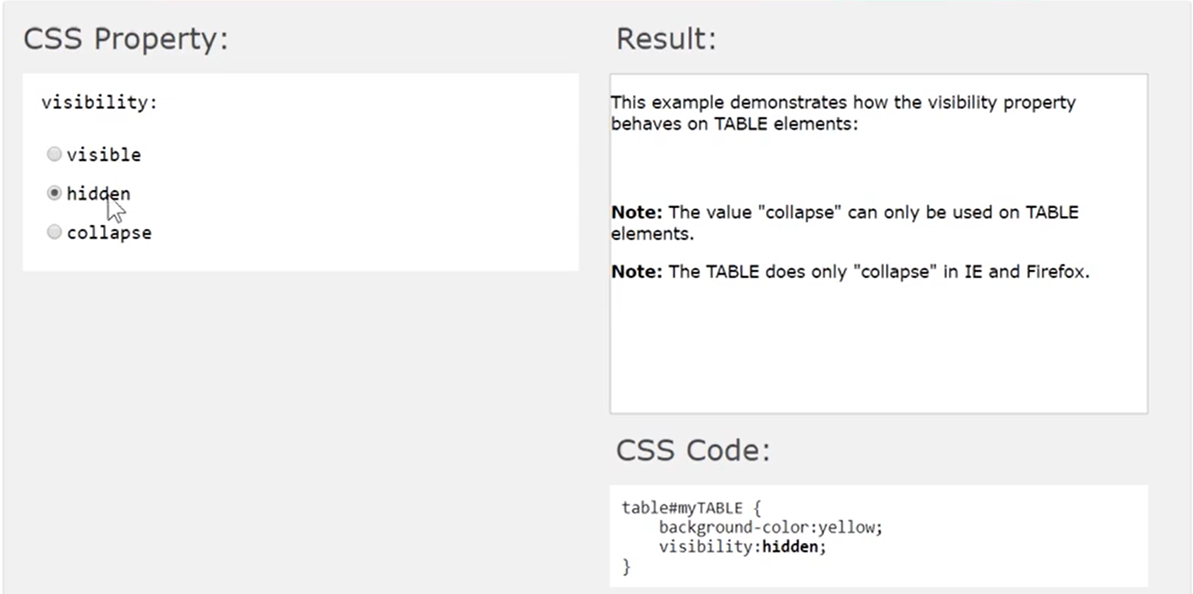 visibility: collapse; /* 셀간의 경계를 무시하고 숨김(박스영역 없음, 테이블의 행과 열 요소에만 지정 가능, 그 외 요소 지정은 hidden과 같음) */