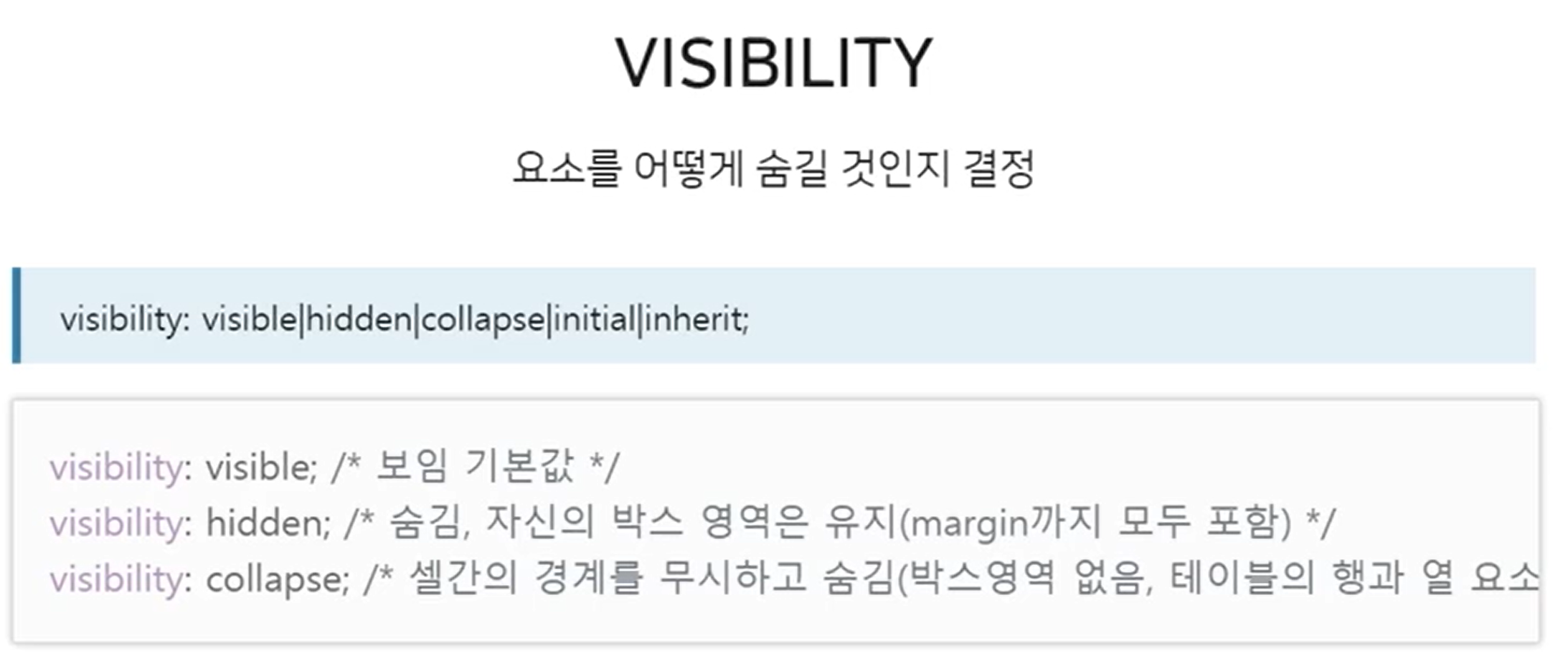 - visibility: hidden: 요소가 보이지는 않지만 렌더링 되며 화면에 공간을 가지고 있음(DOM에 존재함)