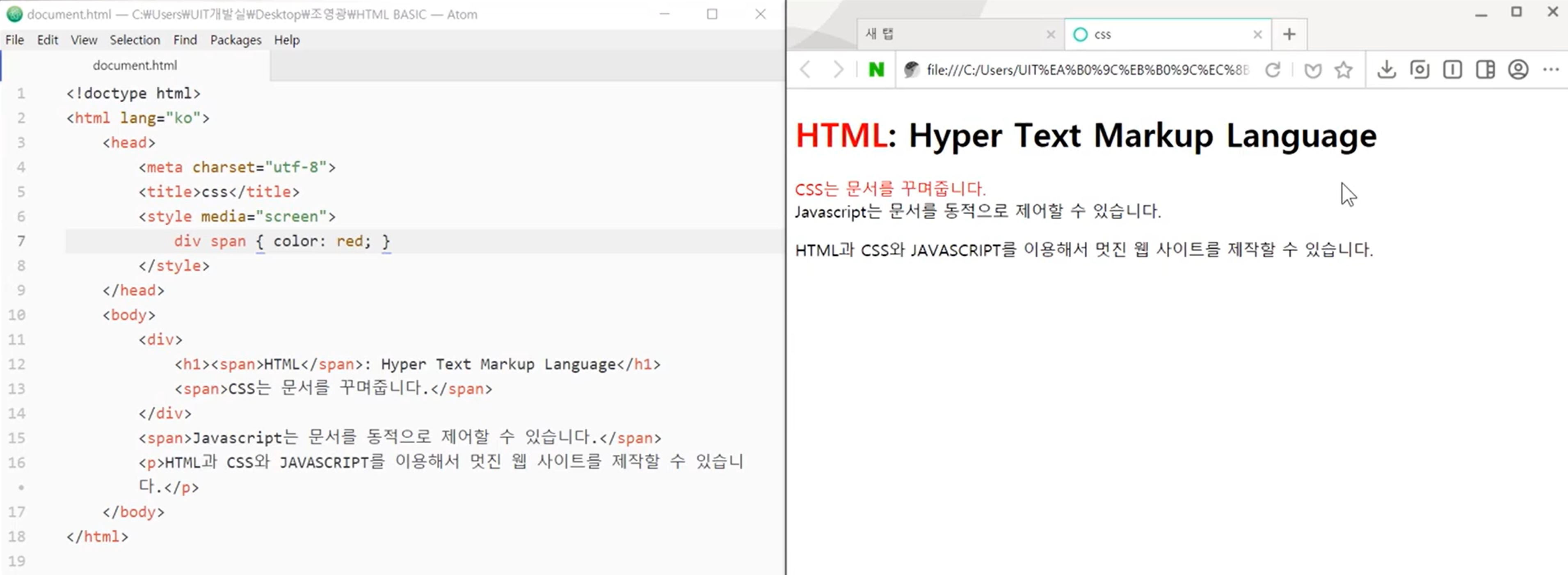 이 선택자는 <div>의 자손 요소인 <span>를 선택하는 선택자 입니다.