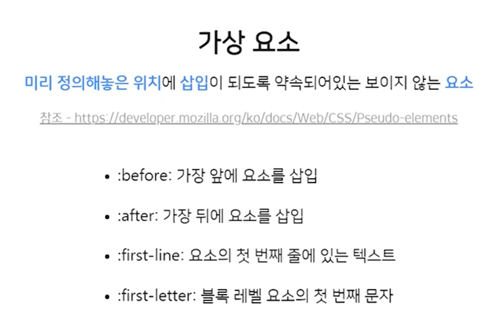가상 요소는 HTML 코드에 존재하지 않는 구조 요소에 스타일을 부여할 수가 있습니다.