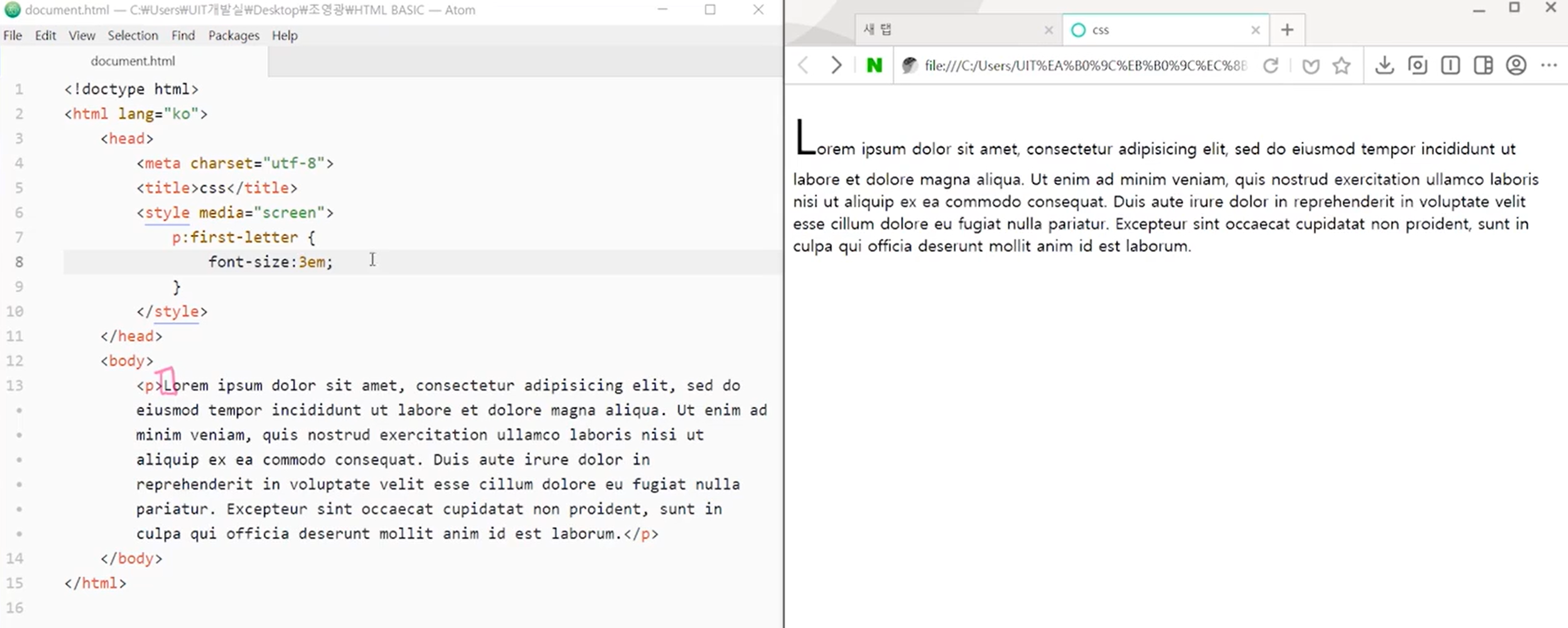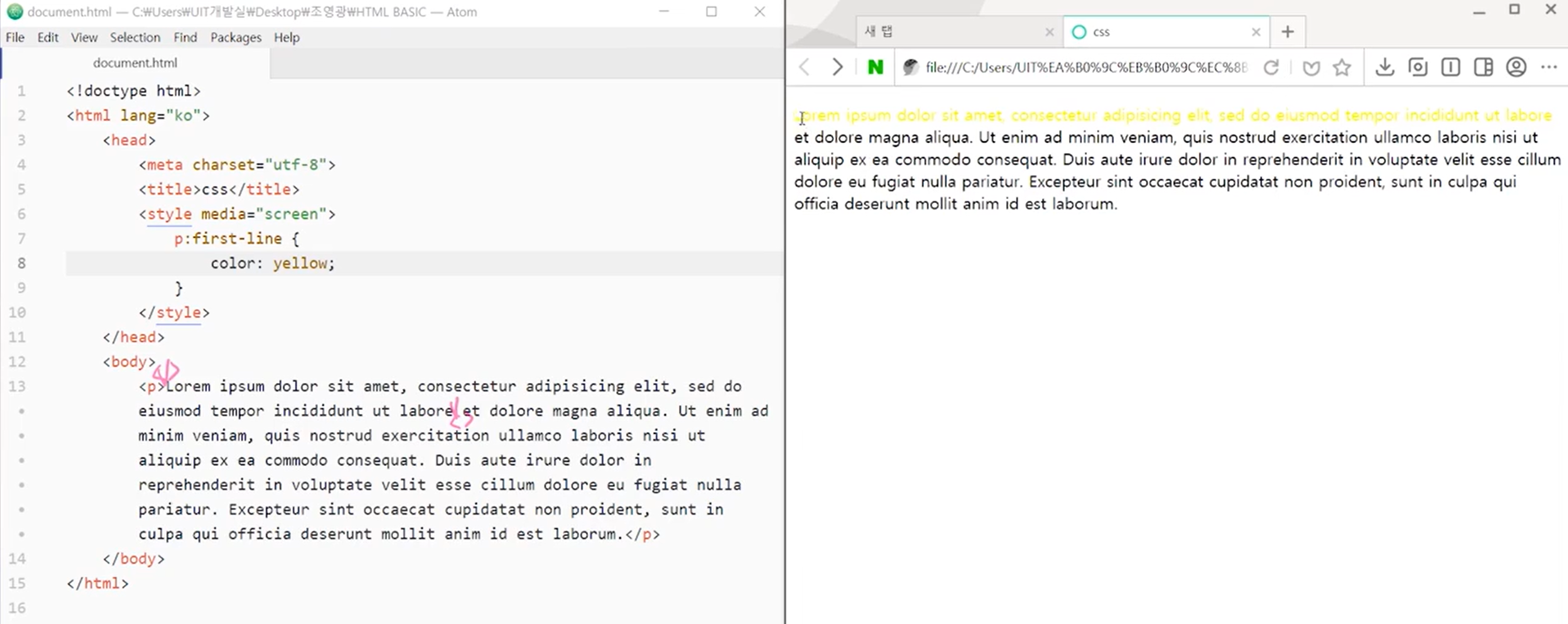 first-line과 first-letter도 마찬가지로 아래 코드와 같은 것으로 생각하시면 됩니다.