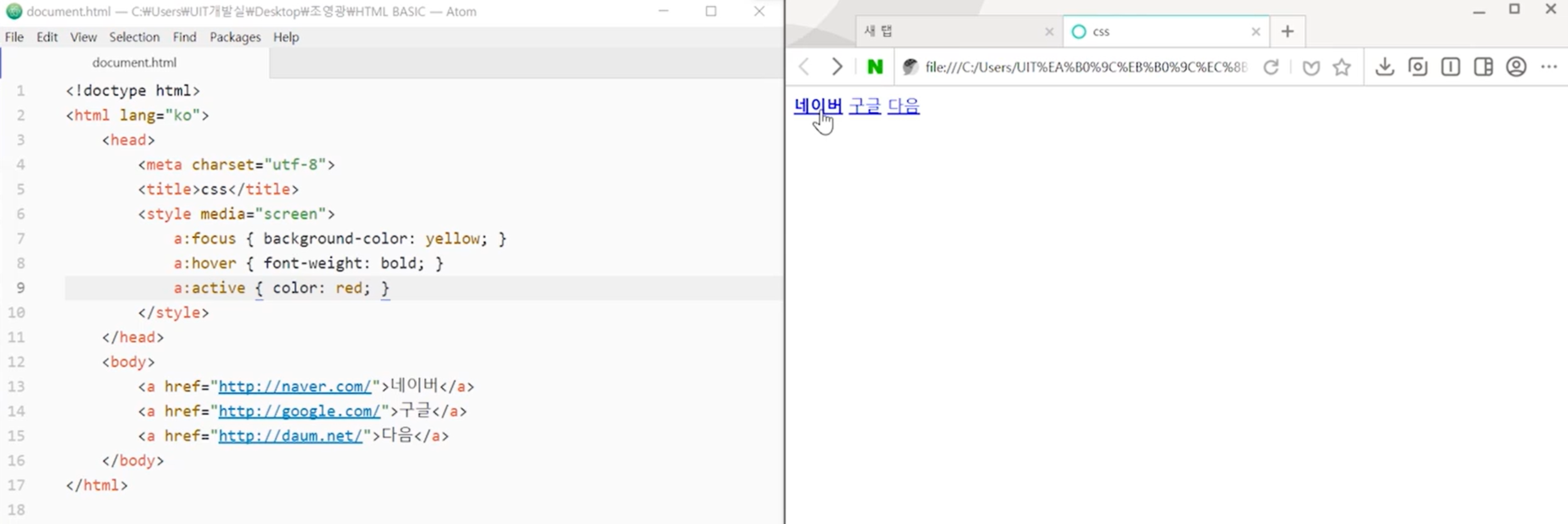 - :link : 하이퍼 링크이면서 아직 방문하지 않은 앵커