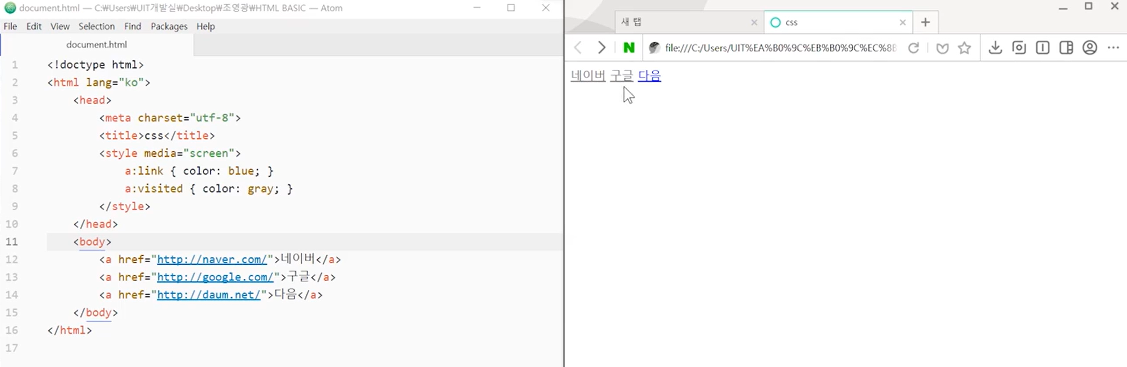 - :visited : 이미 방문한 하이퍼링크를 의미
