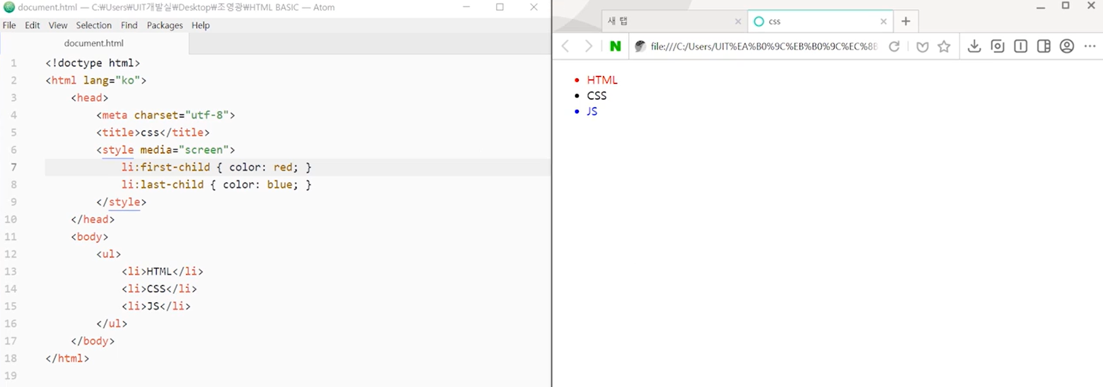문서 구조와 관련된 가상 클래스는 first-child와 last-child 가상 클래스 선택자 입니다.