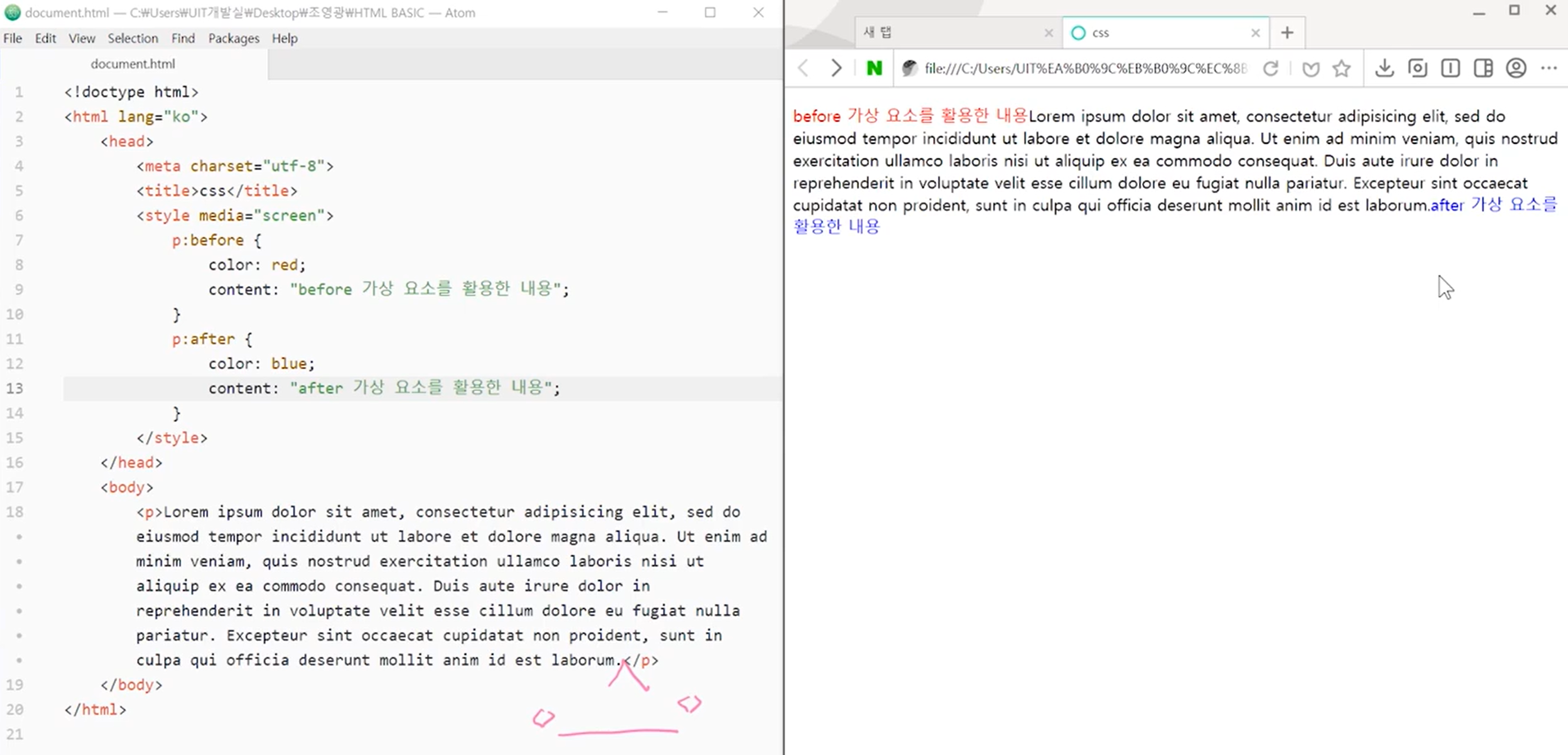 가상 요소도 가상 클래스처럼 문서 내에 보이지 않지만, 미리 정의한 위치에 삽입되도록 약속이 되어있습니다.