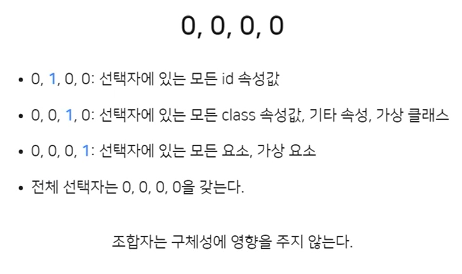 - 전체 선택자는 0, 0, 0, 0을 가진다.
