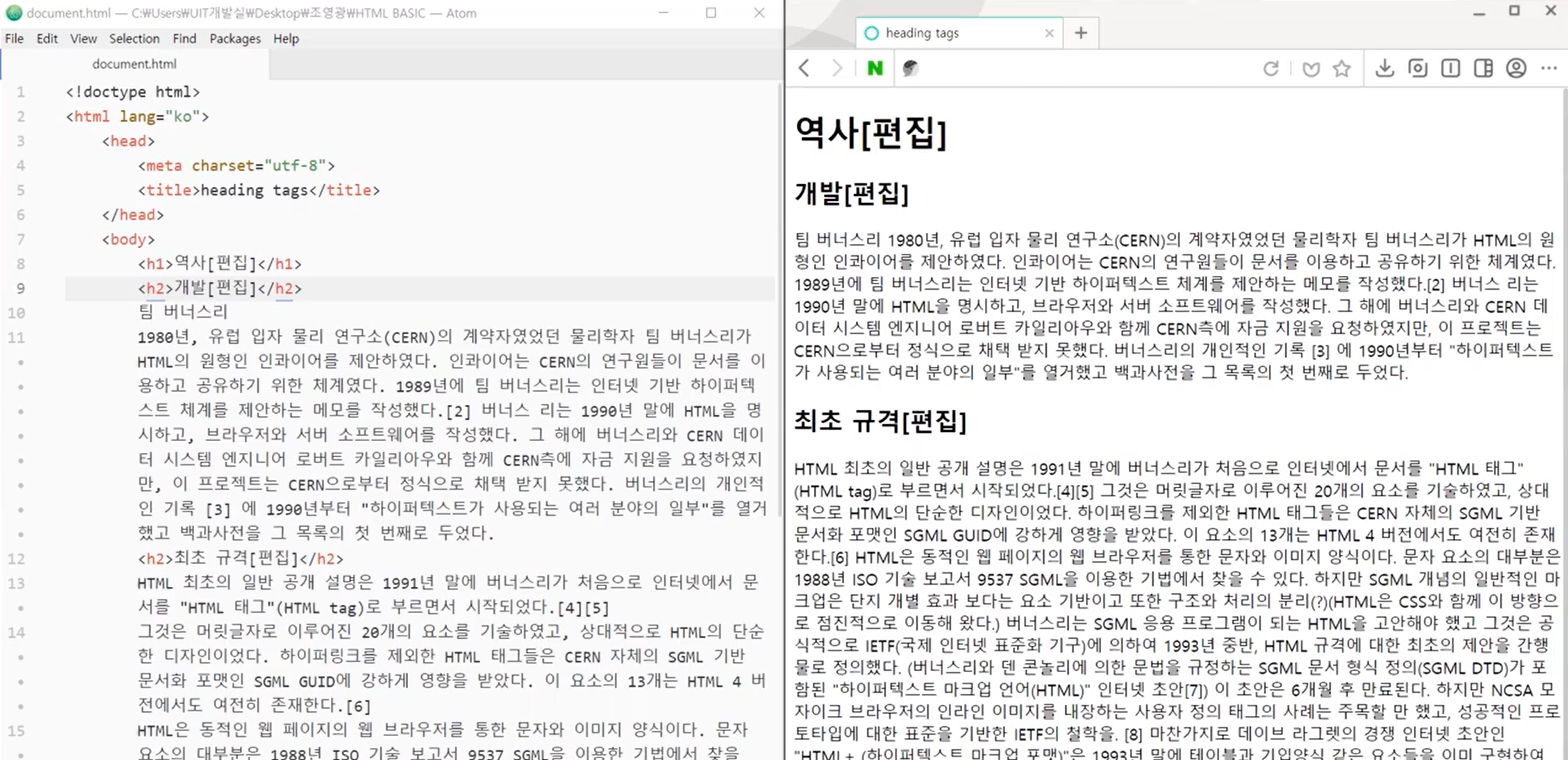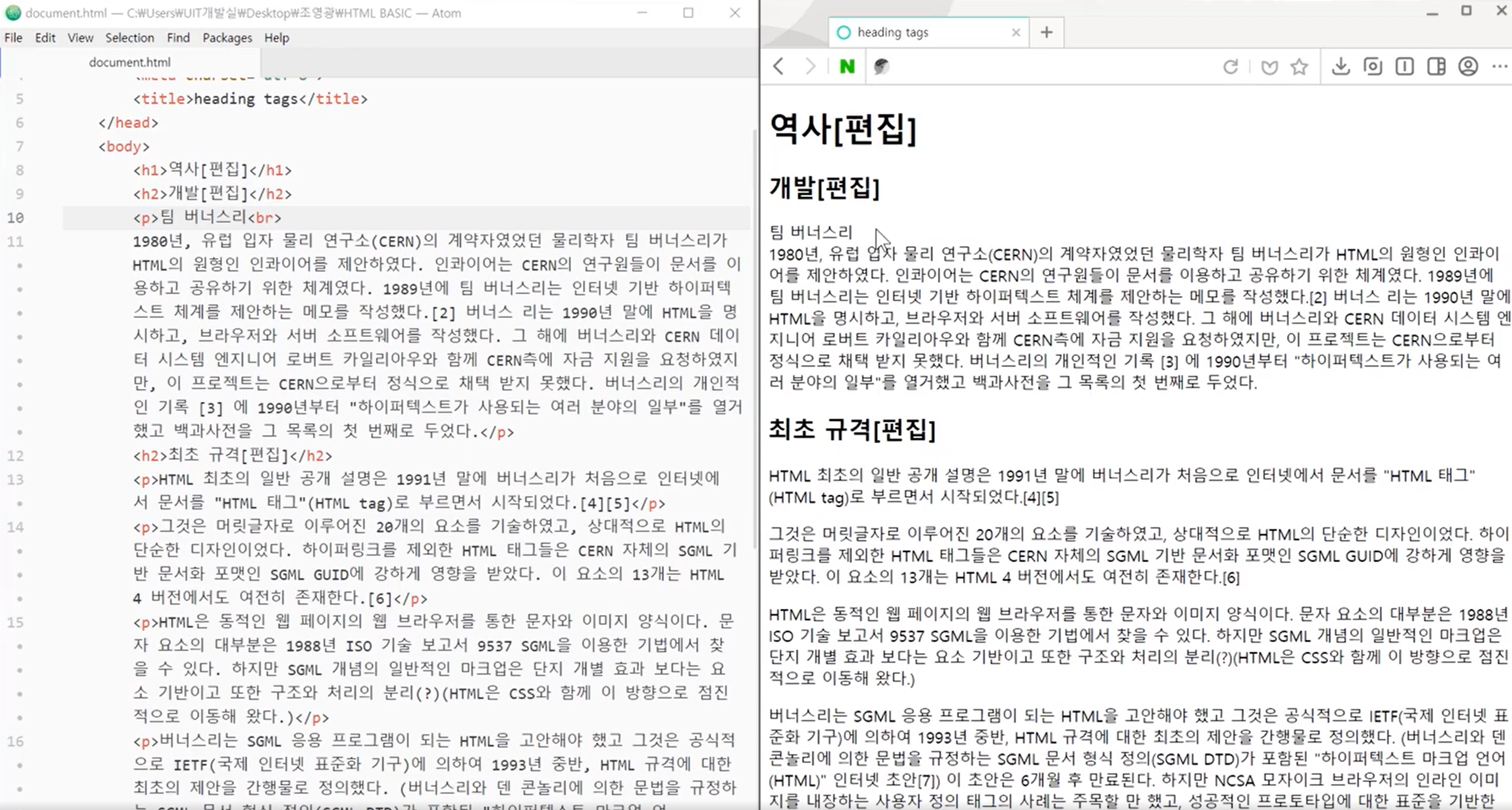 예시 글에서는 역사가 가장 큰 제목이기 때문에 <h1>를 사용했고,